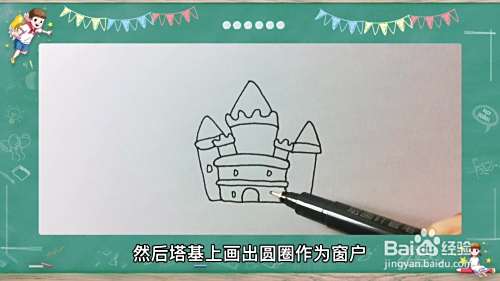 最中间的位置画出三角作为塔顶,两侧以长条形作为塔基,塔基上方同样以三角形作为塔顶,各个塔顶上方画出旗子,然后塔基上画出圆圈作为窗户。