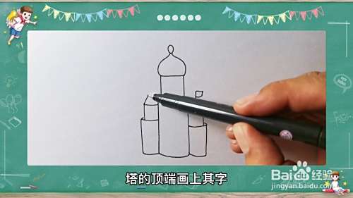 先画一个圆柱形圆柱,上方再画一个稍微细一点的圆柱形,在上方画一个桃形的两个弧线,弧线上方画一圆圈,柱形两侧同样画相对绞窄一点的叠在一起的两个柱形,上方以三角形作为塔的顶端,塔的顶端画上旗子。