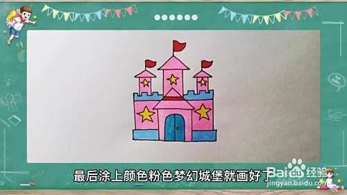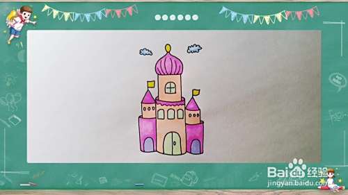 然后在各个尖塔上画上五角形尖塔的顶端,画上棋子,然后最下面的尖塔画出门门,以竖线隔开,画出圆圈为门把手。最后涂上颜色,粉色梦幻城堡就画好了。