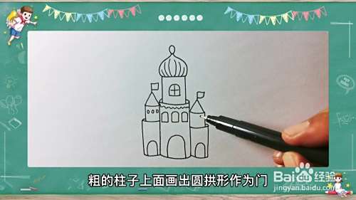 桃形弧状上画出自上而下的弧线,作为纹理,细柱子上画出方形作为窗户,粗的柱子上面画出圆拱形作为门。