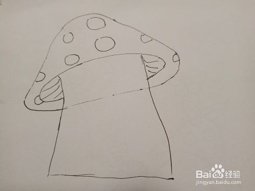 第六步,在菌盖下方我们添加一些菌褶,从菌柄延伸几条线到菌环内侧即可,如下图所示。漂亮的蘑菇就画好了,很简单吧。