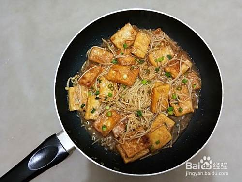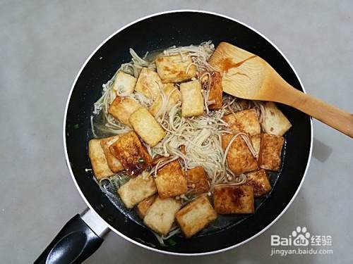 炒至金针菇变软,加入煎好的北豆腐,加入蚝油、食盐、白胡椒粉、