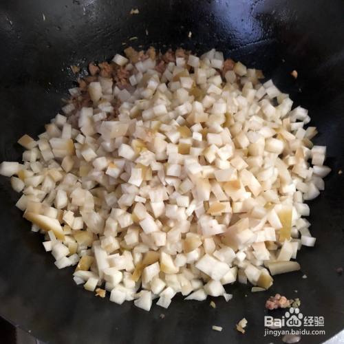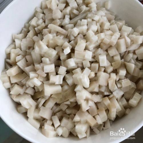 咸菜疙瘩切成丁。去皮鸡肉用搅馅机搅碎后备用。蒜切末