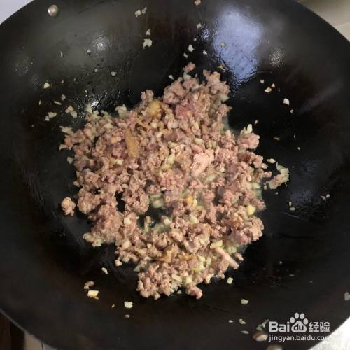 锅中热油,加入蒜末爆香。加入鸡肉末翻炒,加入五香粉