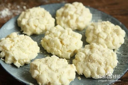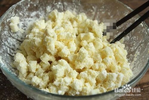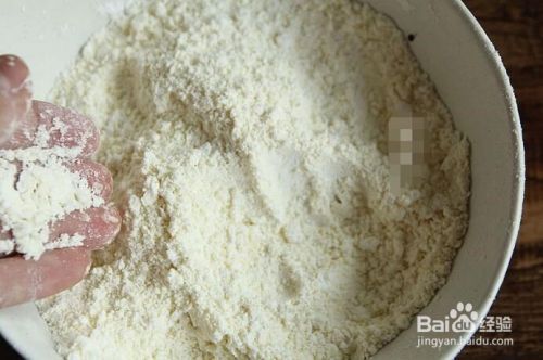 敲入一个鸡蛋到糯米粉里面搅散,使糯米粉成絮状,然后用手捏搓结块的糯米粉,把糯米粉搓散,直到糯米粉全部变成淡黄色的细粉状;
