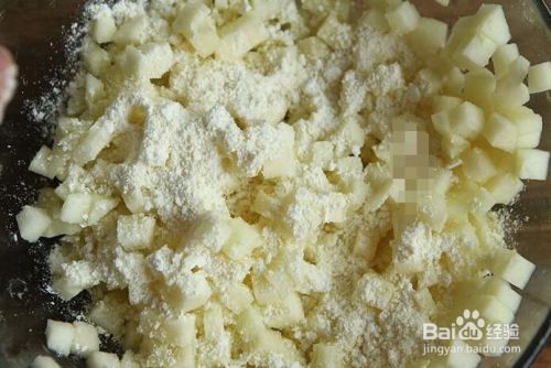 把糯米粉分次少量的加入苹果里,这里主要是起到粘合作用,以免加得太多,后面成品就太干了;