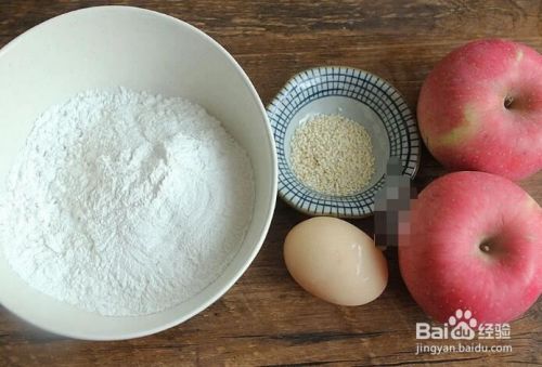 【材料】:糯米粉 100克、苹果 2个、鸡蛋 1个、白芝麻 适量、白糖 50克