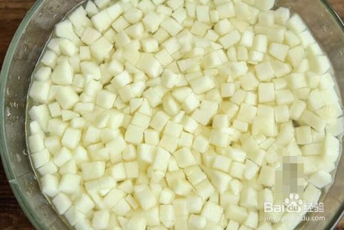 苹果去皮去核,再切成丁,苹果很快就会氧化变色,最好放入水里防止氧化,等全部切好了再捞出来,然后放入白糖腌制20分钟,喜欢吃甜的朋友多放点,苹果会腌制出很多水,然后把水倒掉;