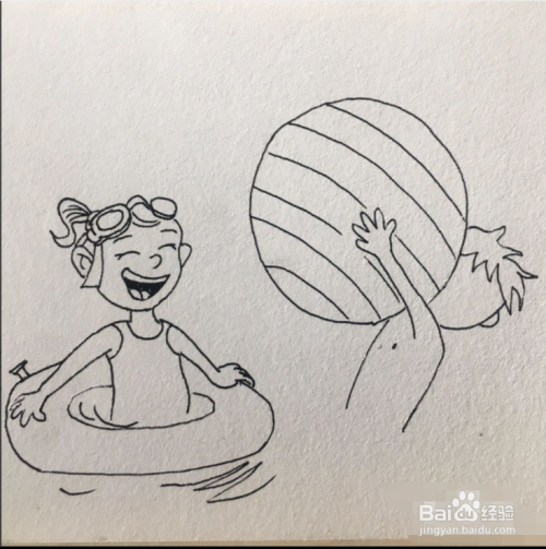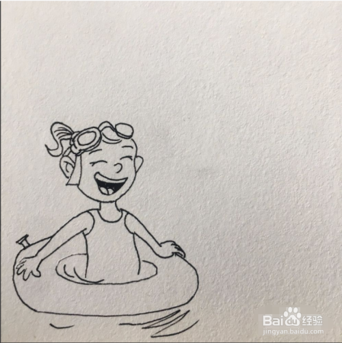 画出一个游泳圈包裹住女孩的身体,并用弧线表现进出的水纹。这样女孩就画好了。