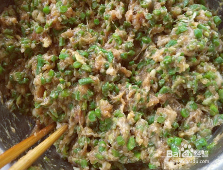 豆角切成末,放入一个大碗中,加上点食盐,用手揉搓一会,待看到其微微湿软的状态,放入在肉馅中拌均匀,馅料便做好了;