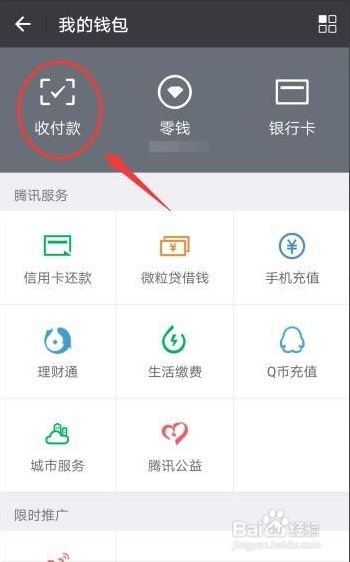 点击打开“钱包”后,显示的是我的钱包里的各种功能。在我的钱包功能里有一个“收付款”的图标和字样,点击打开“收付款”。