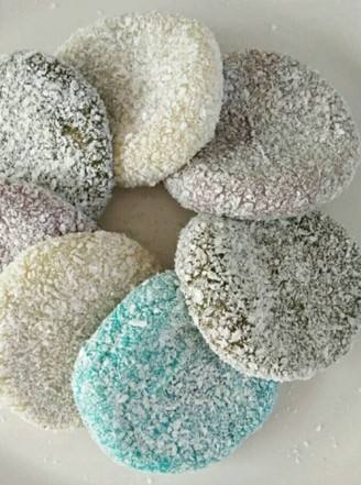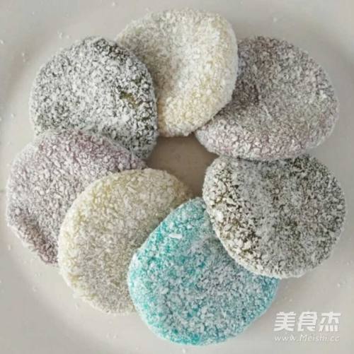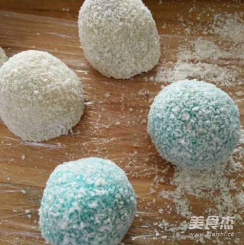 揉成圆形状以后,裹上椰蓉,然后把它按平,就做好了。