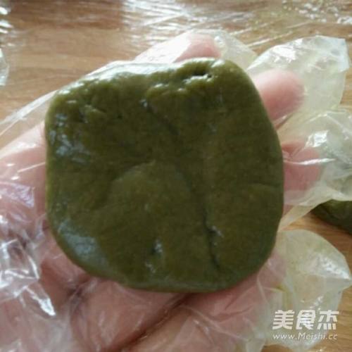 抹茶糯米饼放入紫薯馅或豆沙,然后揉成圆形。