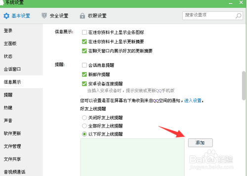 在点选”以下好友上线提醒“该选项后,我们再点击它旁边的“添加”按钮。