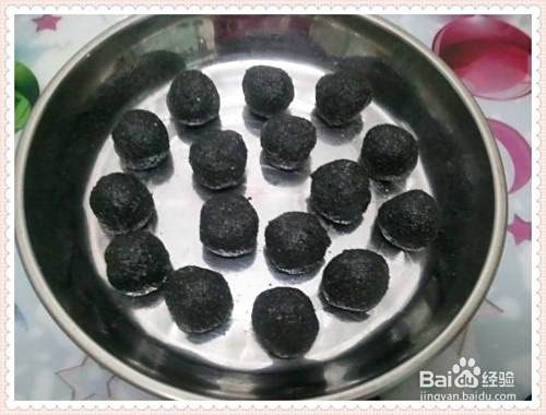 在黑芝麻粉中掺入白糖,然后加入蜂蜜和油搅拌均匀,再做15克馅料(我觉得有点大)冷冻,使之更好。