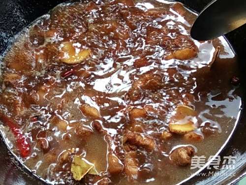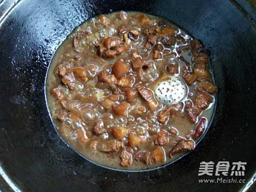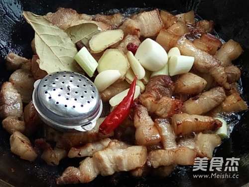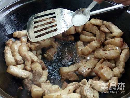5翻炒至出油,加入白砂糖继续翻炒至肉上色。