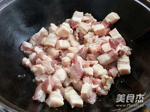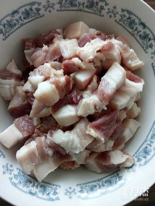 1五花肉整个洗净,用厨房用纸吸干水,切成块,大小随意。