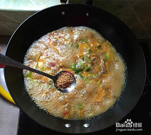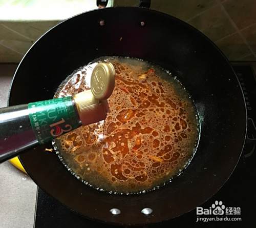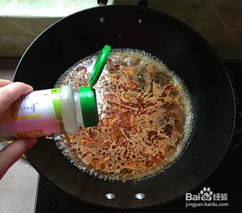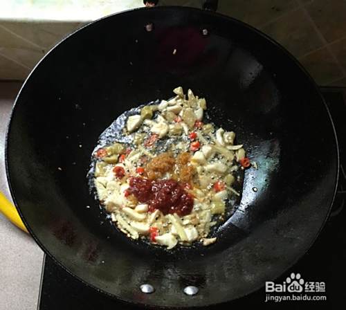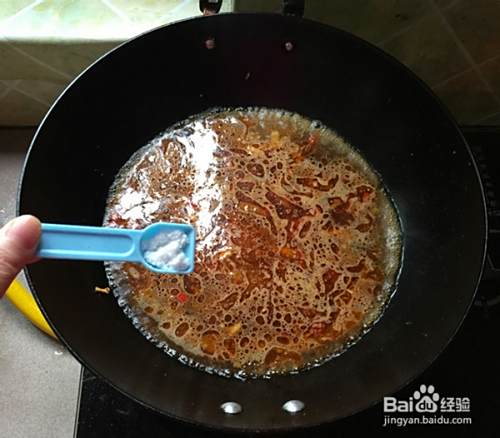煸出香味后加入辣椒酱,炒出红油后加入适量清水。