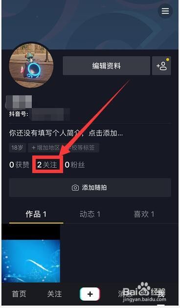 个人中心页面,点击“X关注”(X是自己关注的人数)