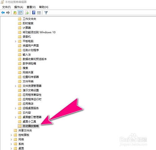 依次展开树状节点菜单选项"本地计算机 策略\用户配置\管理模板\Windows组件\自动播放策略"。