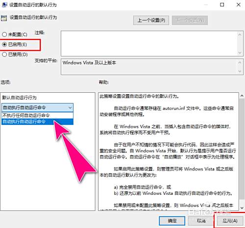 进入后,勾选中"已启用"单选项,再自定义设置默认的自动运行行为选项,点击"应用"按钮生效。