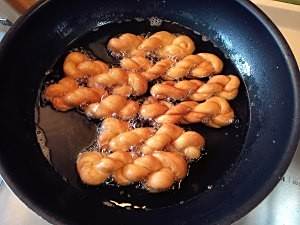 油锅六成热,麻花慢炸至浮起颜色变黄