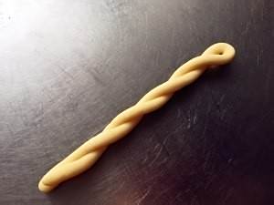 将所有原料都放入盆中,和好面,覆盖保鲜膜或者盖上盖子松驰40分钟,取出面团分成两份,搓成长条绕紧成为两股麻花