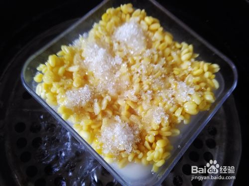 6分钟后的粉糊已经定型,然后把蒸熟的绿豆铺到面上,再撒适量的白糖进去。