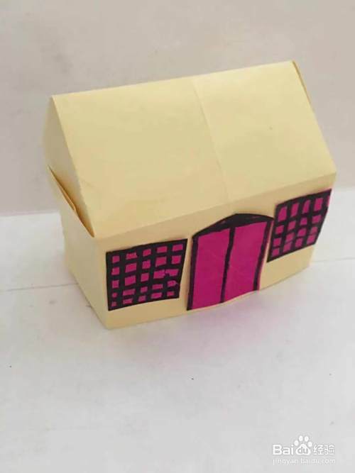 第六步 粘完之后 小房子的另一头同样操作一遍 然后把预先在二红色彩纸上画好的门窗剪下来粘在合适的位置上 一座漂亮的小房子就制作完成了