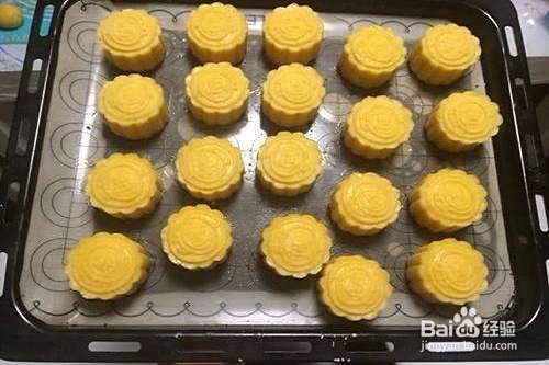 将压好形状的月饼放在烤箱中,200°上下烤7分钟。之后刷上蛋黄液,再烤7分钟,就可以吃了。