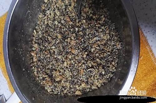 准备一个可以密封的袋子,装入花生、核桃仁,用擀面杖压碎后,装入碗中。