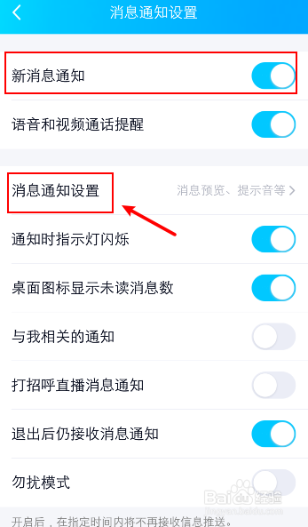 在消息通知页面,打开“新消息通知”的按钮,再点击“消息设置设置”。
