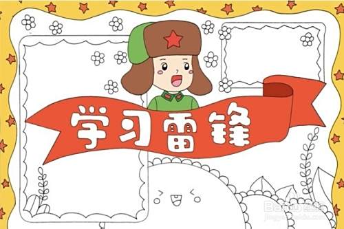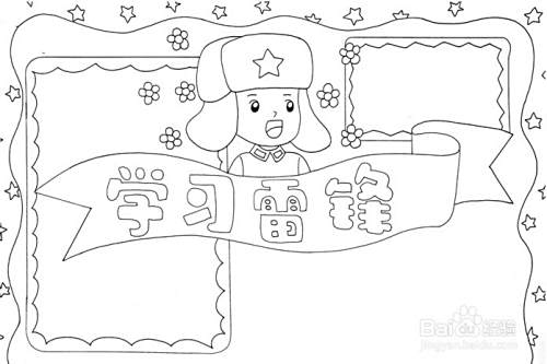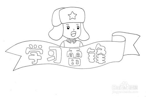 首先在中间画上一条飘带,里面写上报头文字“学习雷锋”,上面画出雷锋同志的半身像,注意在他的帽子上画一个五角星。