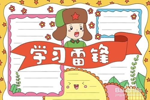 先在中间画上一条飘带,里面写上报头文字,上面画出雷锋同志,然后画出背景边框和里面的两个小边框,左下角画上向日葵和植物,再画上小花朵和小星星作为装饰,涂上合适的颜色,最后画上文字栏,简单的手抄报就画好了。