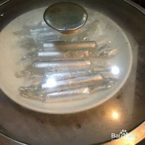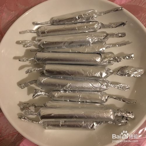 锡纸提前准备剪好长方形,裱花袋肉裱肉火腿肠的造型,再卷起来像糖果一样,稍微紧实些。
