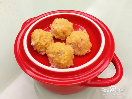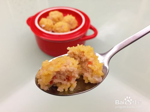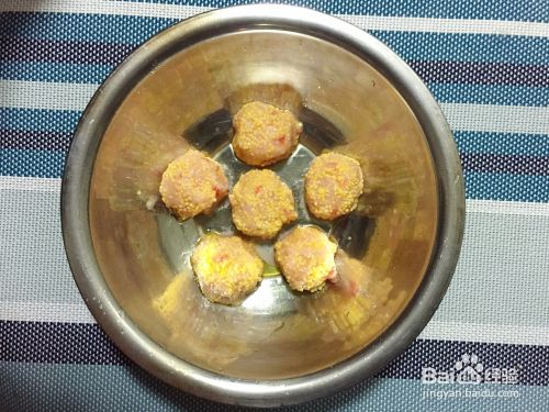 小米沥干水,将肉末搓成一个个小丸子,在小米里滚一圈,放进盘子里。