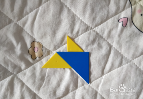 放上左右挨着的黄色小三角形、蓝色三角形,如图。