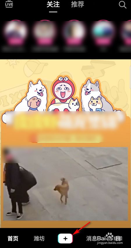 打开抖音之后,点击下方中间的“加号“按钮,如下图所示。