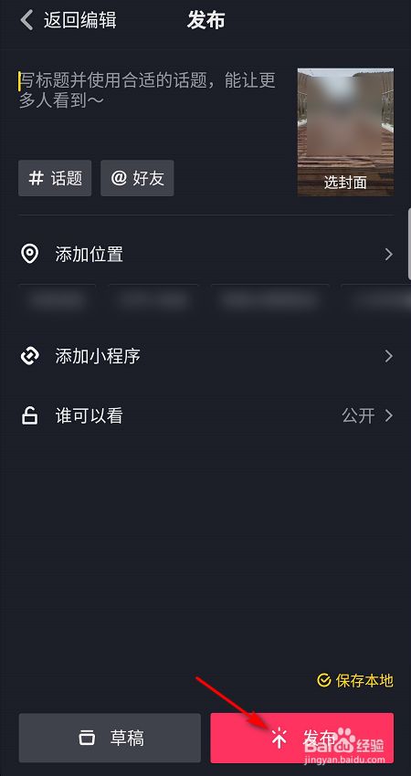 6.设置封面和文字,点击发布,完成抖音带货视频的发布。