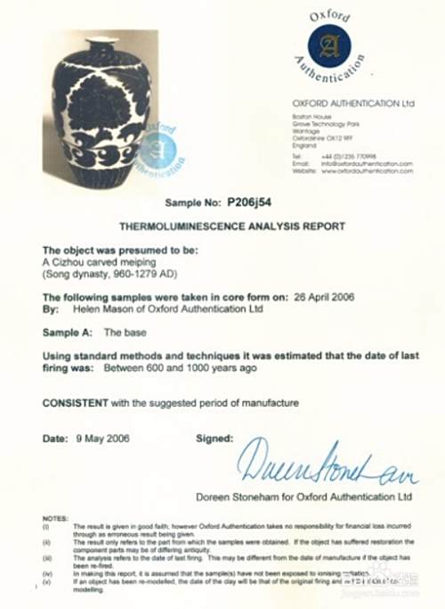 请认准正确的《英国牛津鉴定检测报告》1、全英文;2、蓝色英国牛津鉴定标识(形状像大写字母A);3、只有陶瓷热释光鉴定报告,没有其它光谱类鉴定报告。