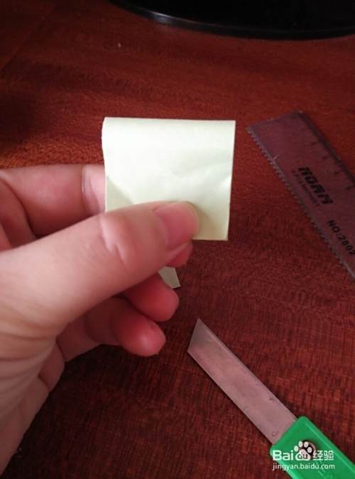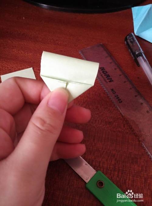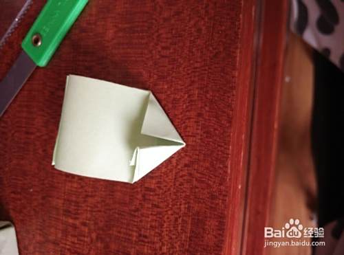 把长方形纸对折,然后在下端折一个三角对其,再插进正方形边缘的缝隙里。往上按压整理一下。对面同样操作。