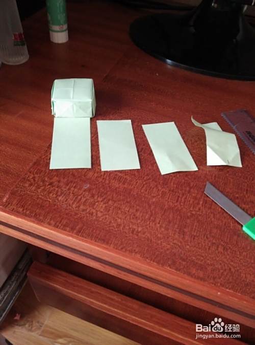 准备2张小正方形纸,把它裁剪成4条宽度和正方形一样长的长方形。