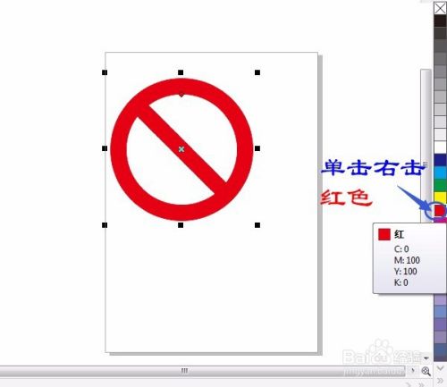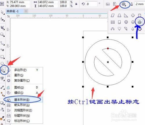 单击选“基本形状”在属性栏中选禁止标志,按Ctrl键(正圆图形)画出禁止标志。如图: