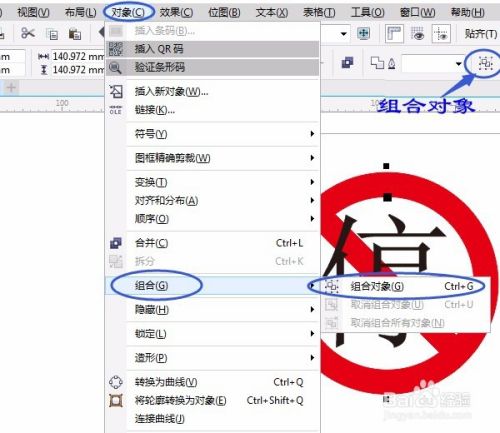 复制一个禁止图形,输入P,制成另一种禁止标志。用“选择工具”框选两个对象,按快捷键Ctrl+G组合对象,或单击“对象”菜单→组合→组合对象 Ctrl+G。两个对象或以上组合成一个整体,或单击属性中的组合对象图标。如图: