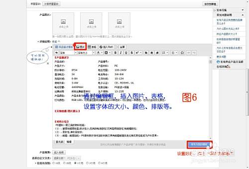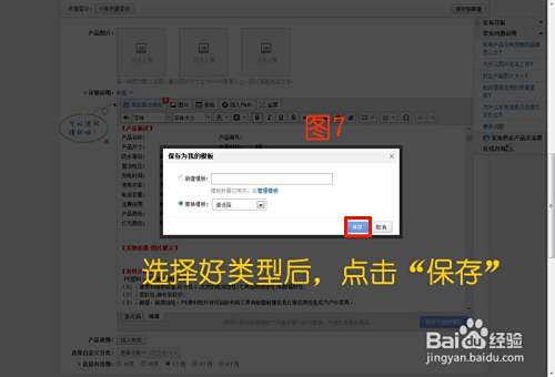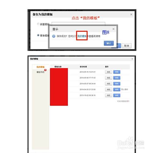 第五,在发布产品信息页面,找到“详细说明”,通过编辑框,将原先在记事本、word、photoshop、图片等中准备好的信息导入到编辑框中,然后进行排版,确认好后,点击“保存为我的模板”,会出现一个“保存为我的模板”对话框。如果是新建的模板,就重新命名。如果是来替换以前的模板,就选择替换模板里的选择框。然后点击“保存”按钮,会弹出一个确认弹框,可以从弹框进入“我的模板”,看下模板保存的情况。如图6、7、8所示。