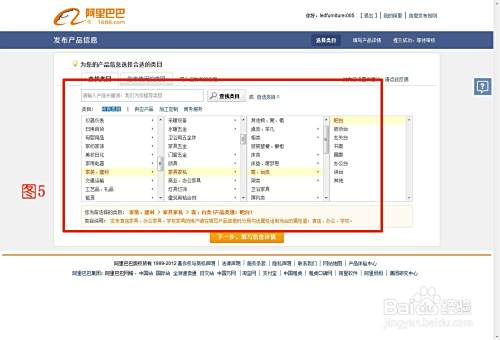 第四,在选择类目页面,通过查找找到类目,进入填写产品详情的页面,如图5所示。