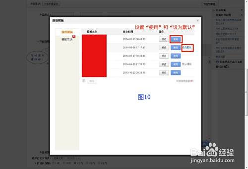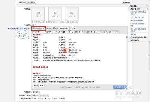 第六,在发布产品信息的时候,找到“商品描述模板”并点击,进入我的模板,然后选择需要的模板,点击“使用”按钮即可以将模板信息导入编辑框,然后在编辑框中进行加入针对每个产品的信息。也可以在我的模板种,将模板设为默认模板,这样的话,在发布产品的时候,就不用重新选择模板了,可直接在编辑框加入信息即可。如图9、10所示。