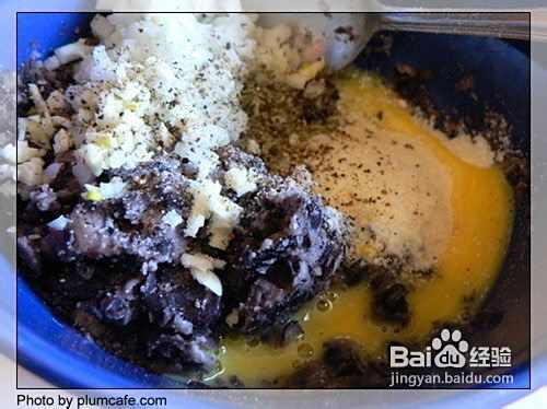 煮熟的黑豆一碗,用勺子背儿碾碎。加蒜末,孜然粉,盐,洋葱碎丁2大匙,一个鸡蛋,芝士粉2大匙,拌匀。