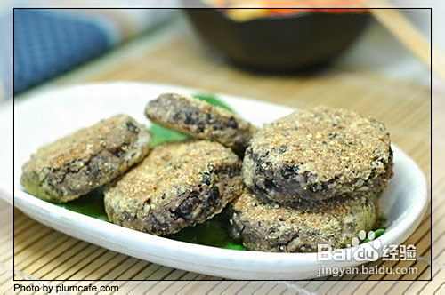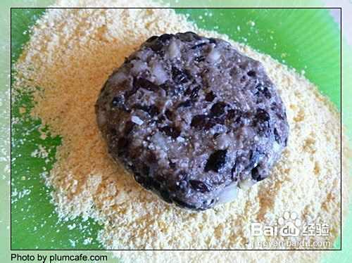 把拌匀的黑豆泥团成小球,再按扁成小饼,然后,把小饼的两面沾上玉米面。在做这一步之前,注意调整豆泥的稠度,应该是很容易就团成球的手感,如果感觉太稀的话,就再加点儿黑豆,如果感觉太干的话,就再加点儿蛋液。