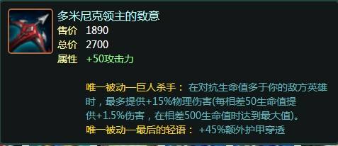 可选装备(根据实际情况选择):面对坦克阵容时羊刀小炮的输出就会比较乏力,多米尼克的领主在此时的性价比很高。而吸蓝刀提供高额的减cd属性,对于技能cd都比较长的小炮来说再适合不过了。被动的暴击回蓝,让小炮无需担心蓝耗问题,收割残血敌人再也不用担心没蓝了。如果面对的是多ap阵容时必出饮魔刀。多刺客阵容就出血手,可以大大提高存活率。